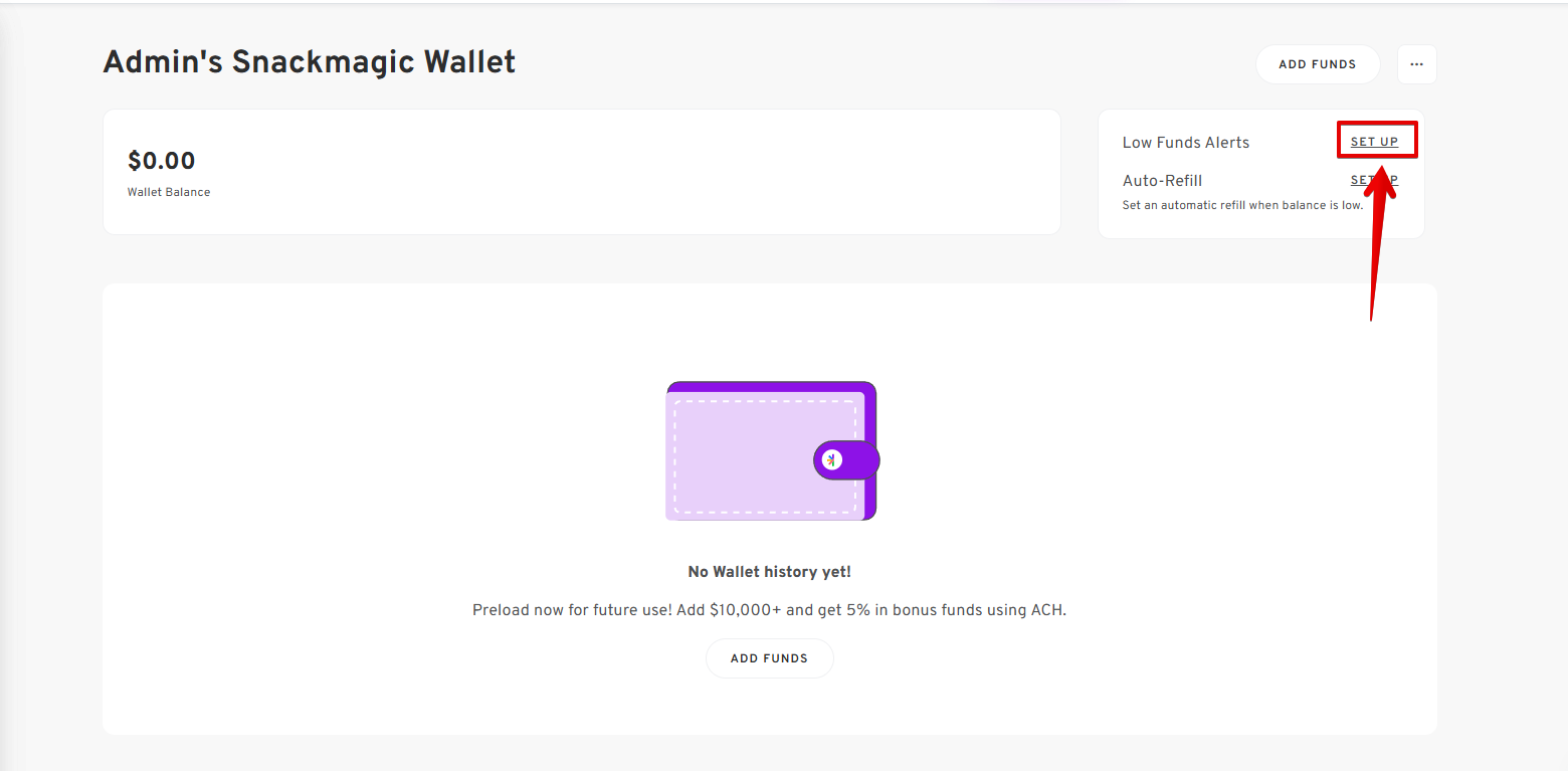 - On the User's Default Wallet's page, click the SET UP button right next to Low Funds Alerts.