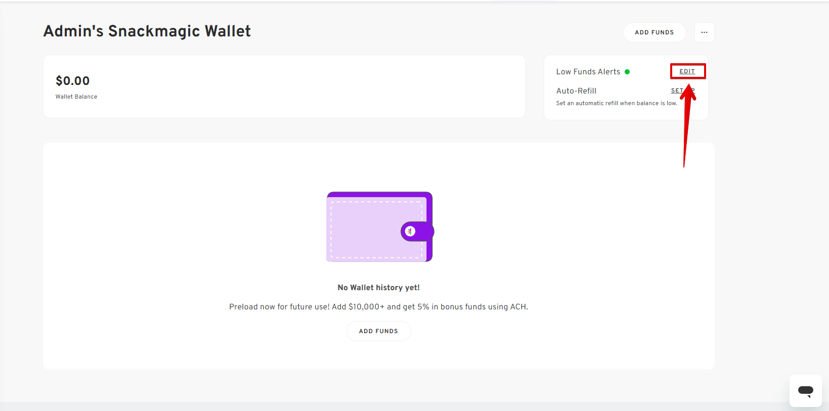 - In your User's Default Wallet Dashboard, click the EDIT button in the Low Funds Alerts section.