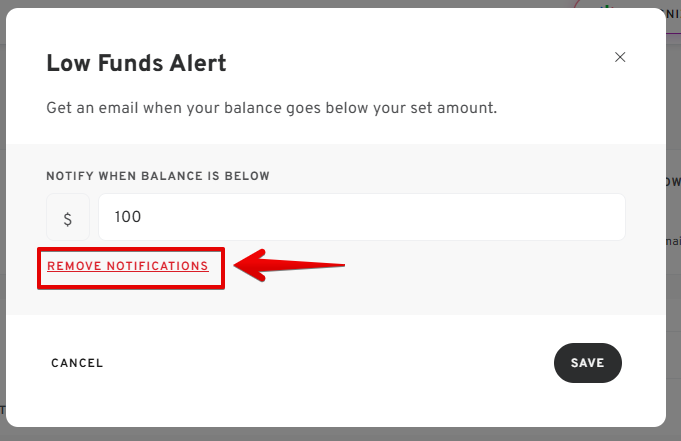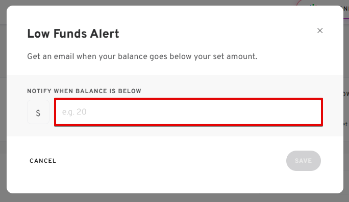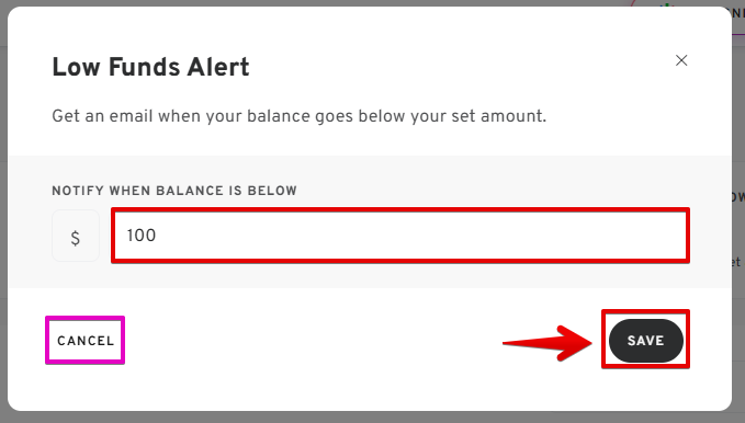 An email notification will be sent when the balance falls below the entered amount.