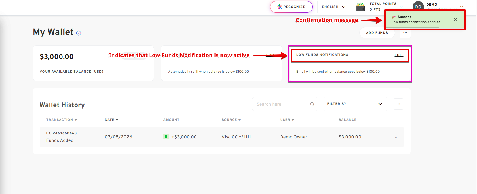 Stay in control of your spending with Low Funds Notifications in your Personal Workspace Wallet. This feature allows you to receive automatic email alerts when your Wallet balance falls below a set amount, helping you avoid interruptions when sending treats, gifts, or rewards. With customizable alert thresholds, you can monitor your Wallet balance and add funds before it runs low, ensuring a smooth and uninterrupted gifting experience.