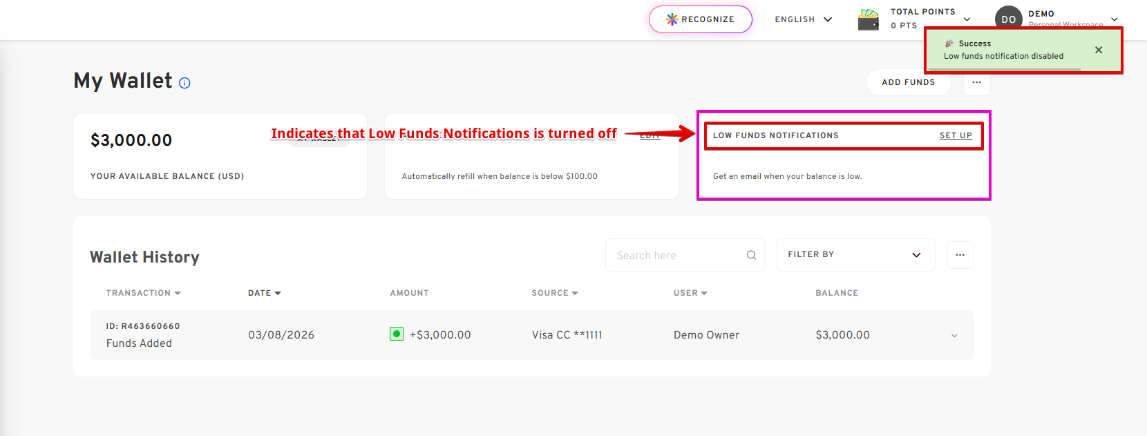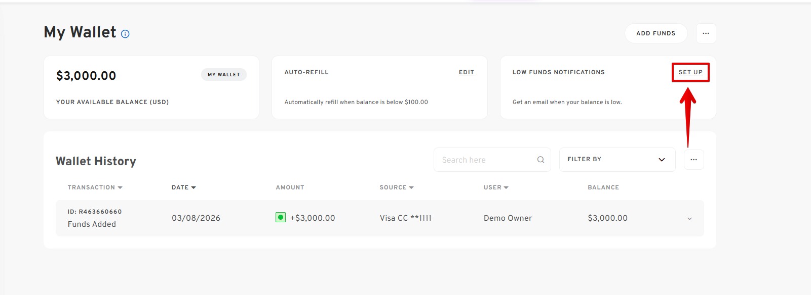 - On the Wallet's page, click the SET UP button right next to LOW FUNDS NOTIFICATIONS.
