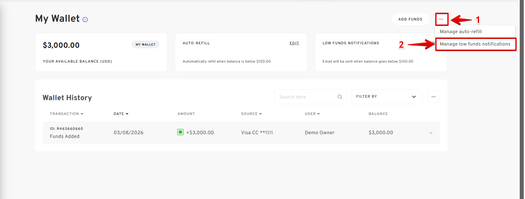 - Activating Low Funds Notifications from the My Wallet Page