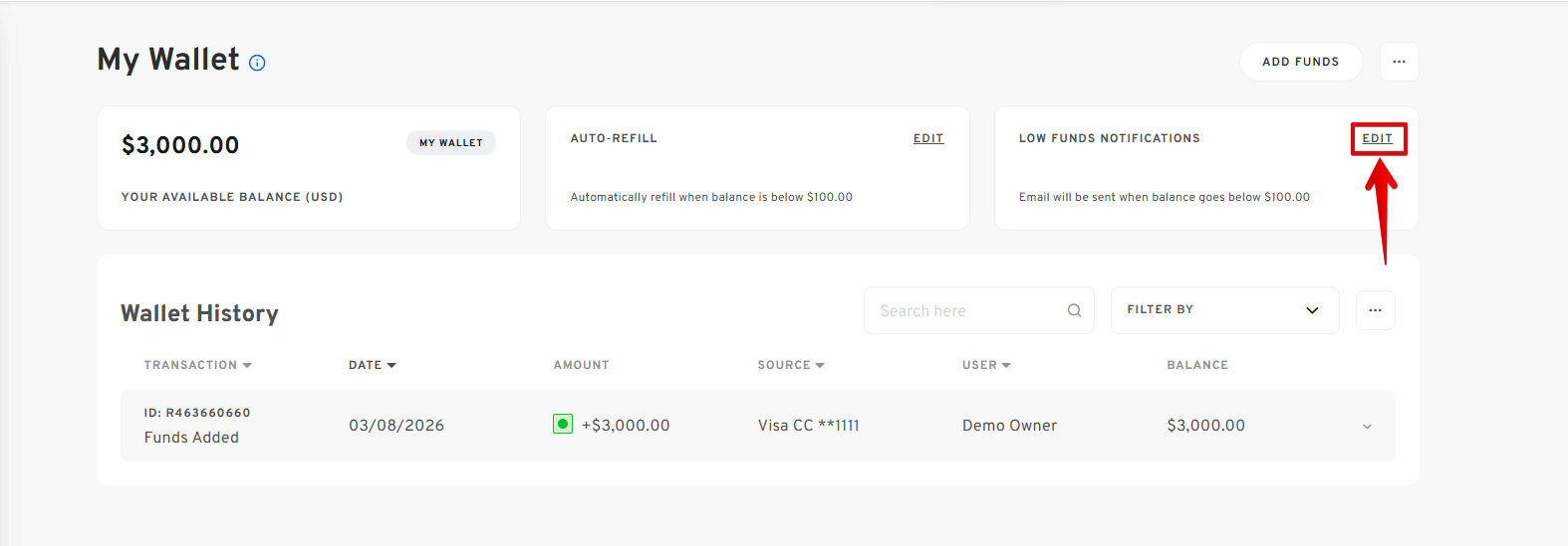 - In your My Wallet Dashboard, click the EDIT button in the Low Funds Notifications section.