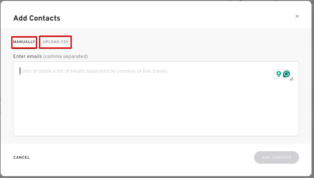 - To add new contacts, you can either add them manually or upload a CSV