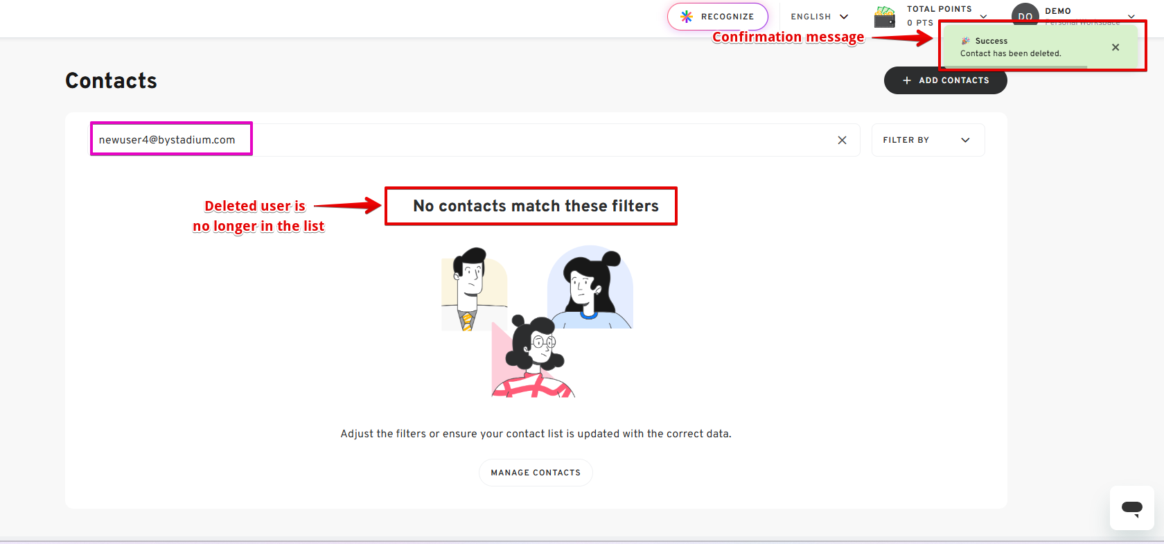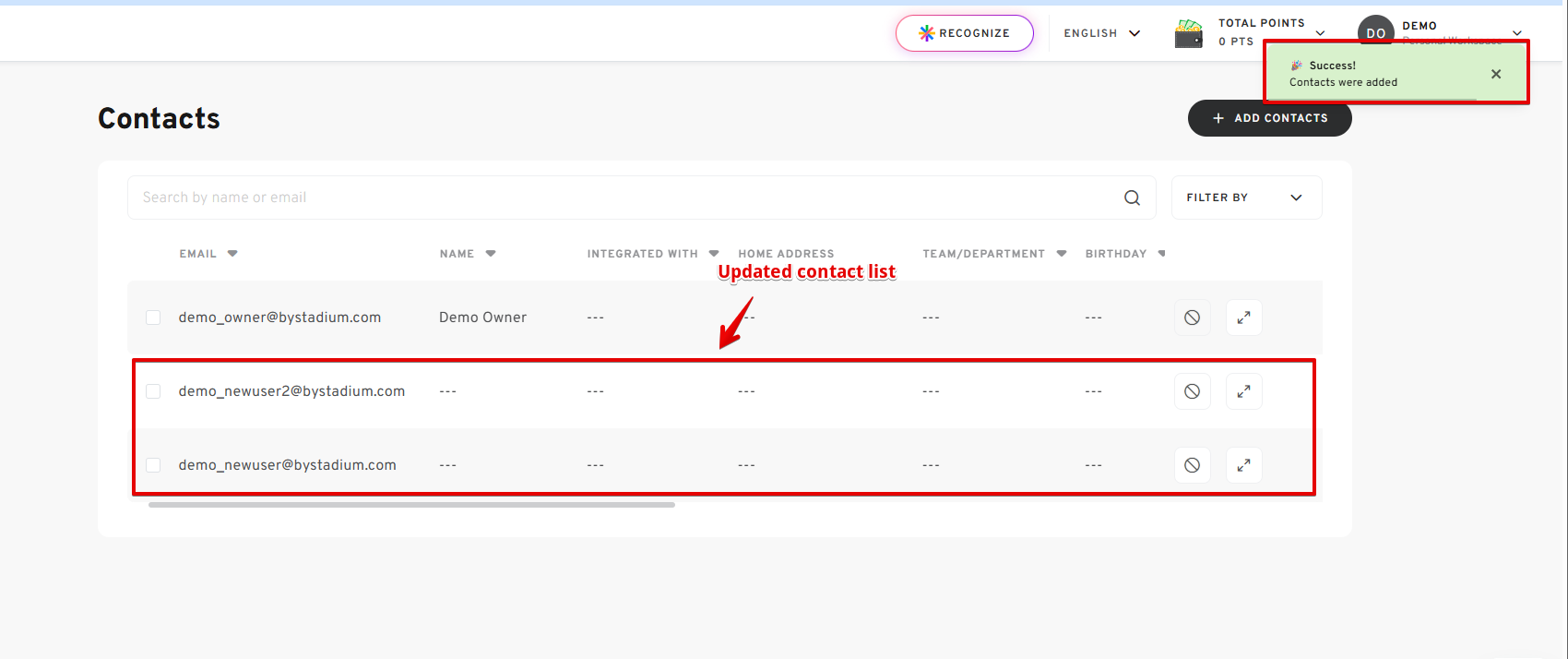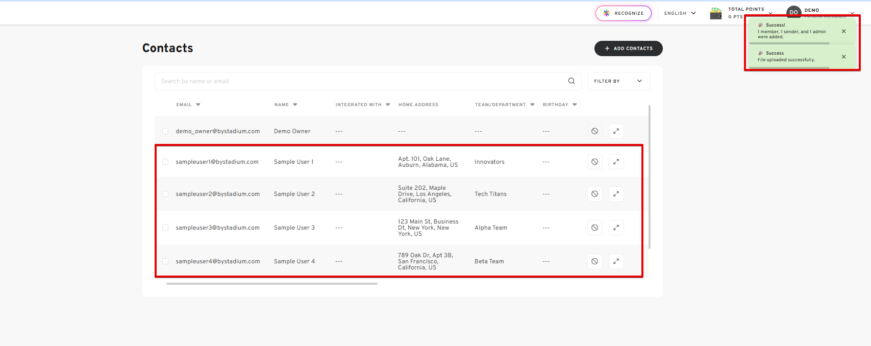 Keeping your contact list organized helps you quickly send gifts, rewards, and communications to the right people. With Stadium’s Personal Workspace contact management tools, you can easily add contacts manually, upload large contact lists using CSV files, update user information, and remove outdated contacts whenever needed.