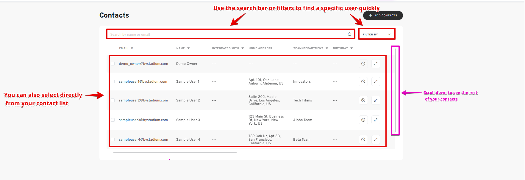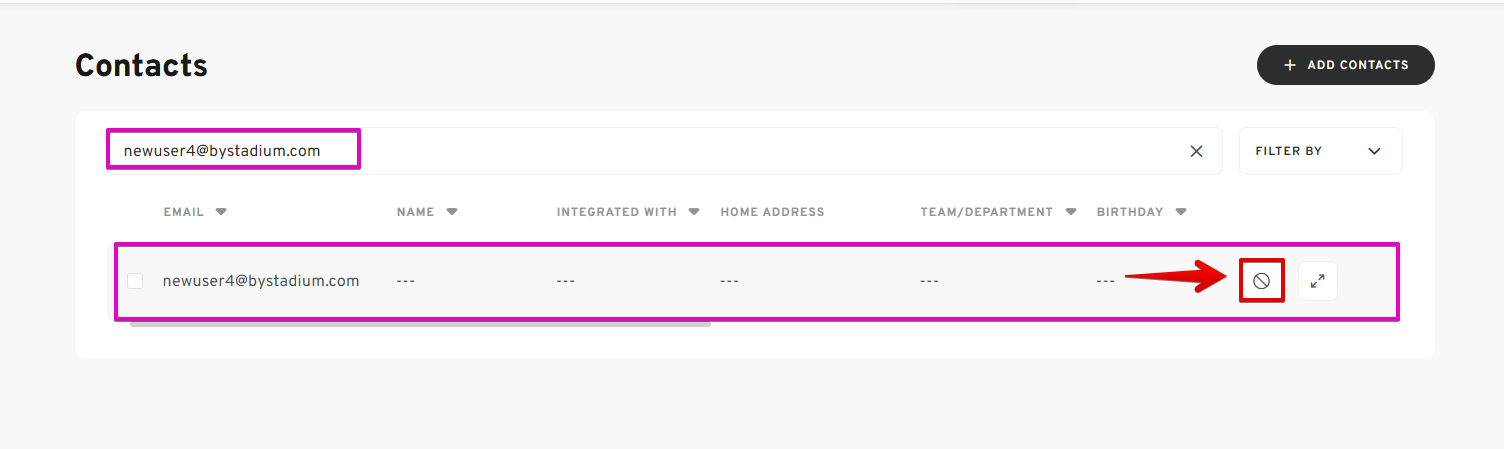 - On the Contacts page, use the search bar or available filters to find the user you want to manage.