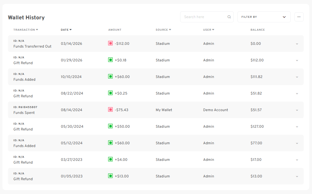 - The Wallet History section will display all past transactions, including fund allocations, spending, funds added, failed transactions, revoked funds, etc.