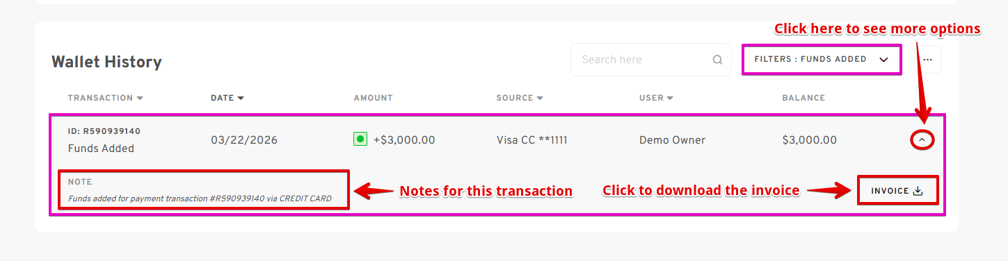 - Click the down arrow on a transaction to view additional details, such as transaction notes added during the order setup, download the invoice, or see details of the failed transaction or funds revocation.