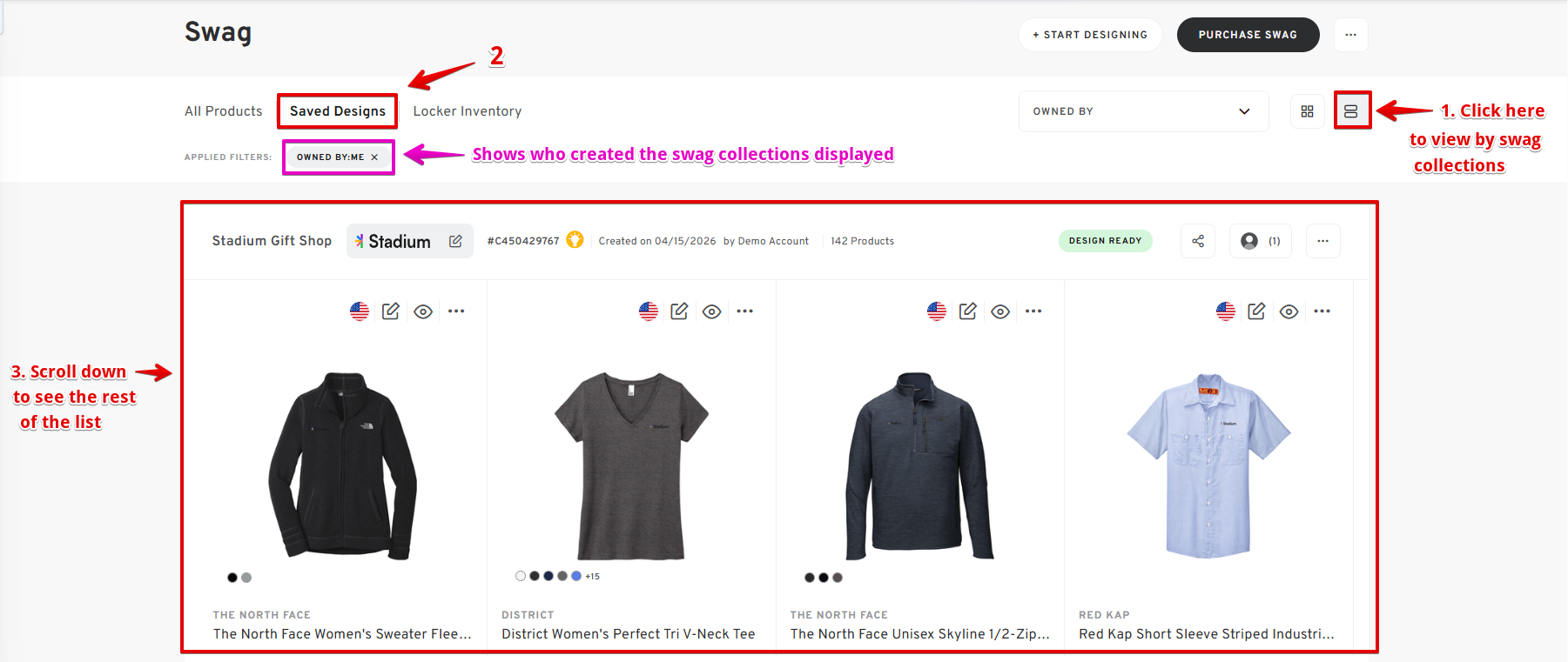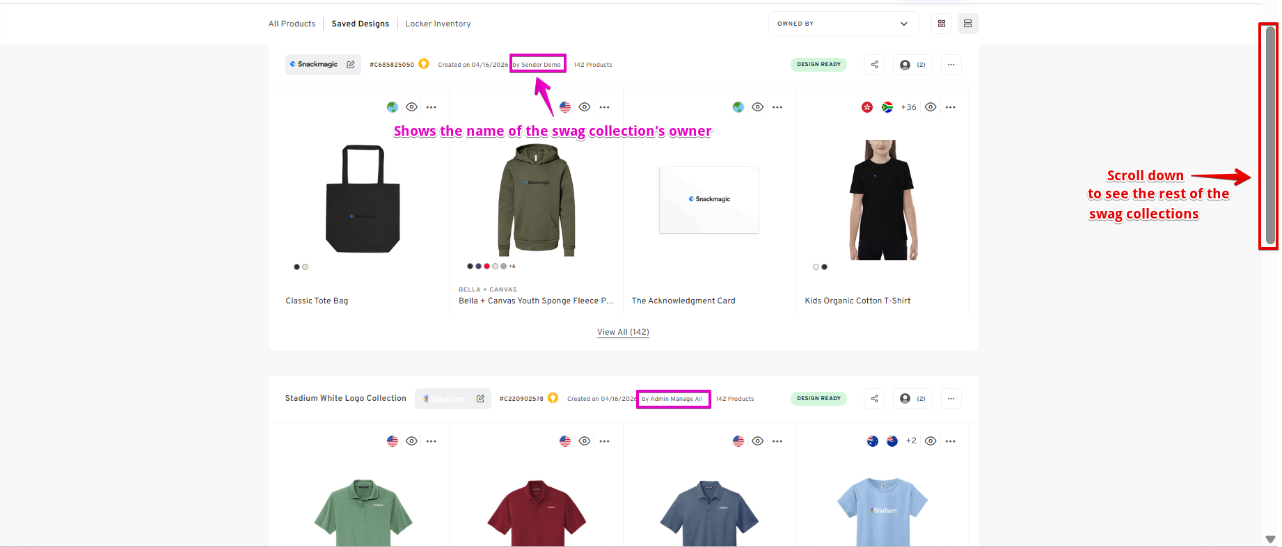 Looking for a way to filter swag collections by owner, find specific swag designs, or manage collections in your Swag page? This guide shows you how to navigate to the Swag page, view saved designs, and filter swag collections by user or owner.