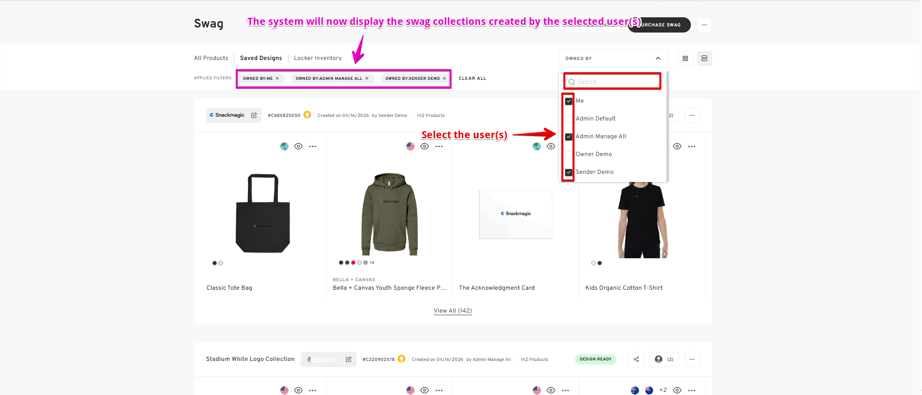 Once selected, the system will automatically display the swag collections created by the selected user(s)